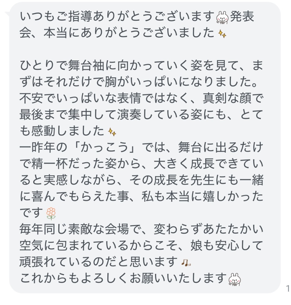 ※今日紹介するコメントは、今回初めて1人デビューをした生徒さん。初めての時は足がすくんでしまってこわばってしまっていた子が、3回目で1人で演奏することができました。感無量👑でした。